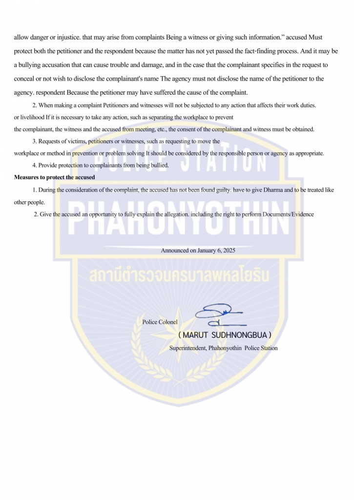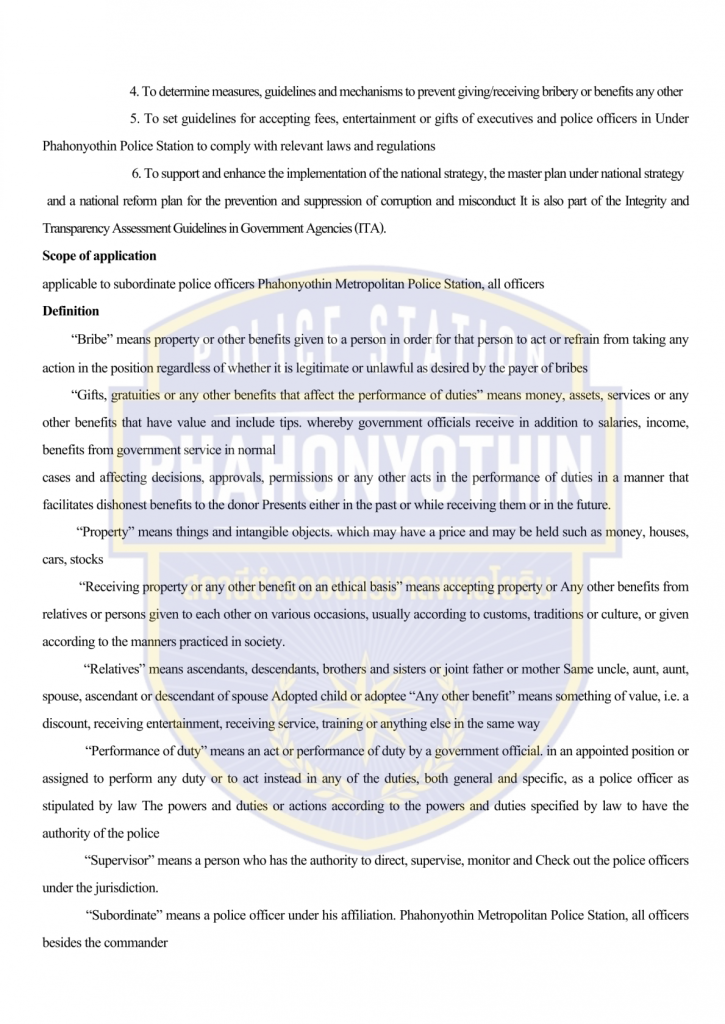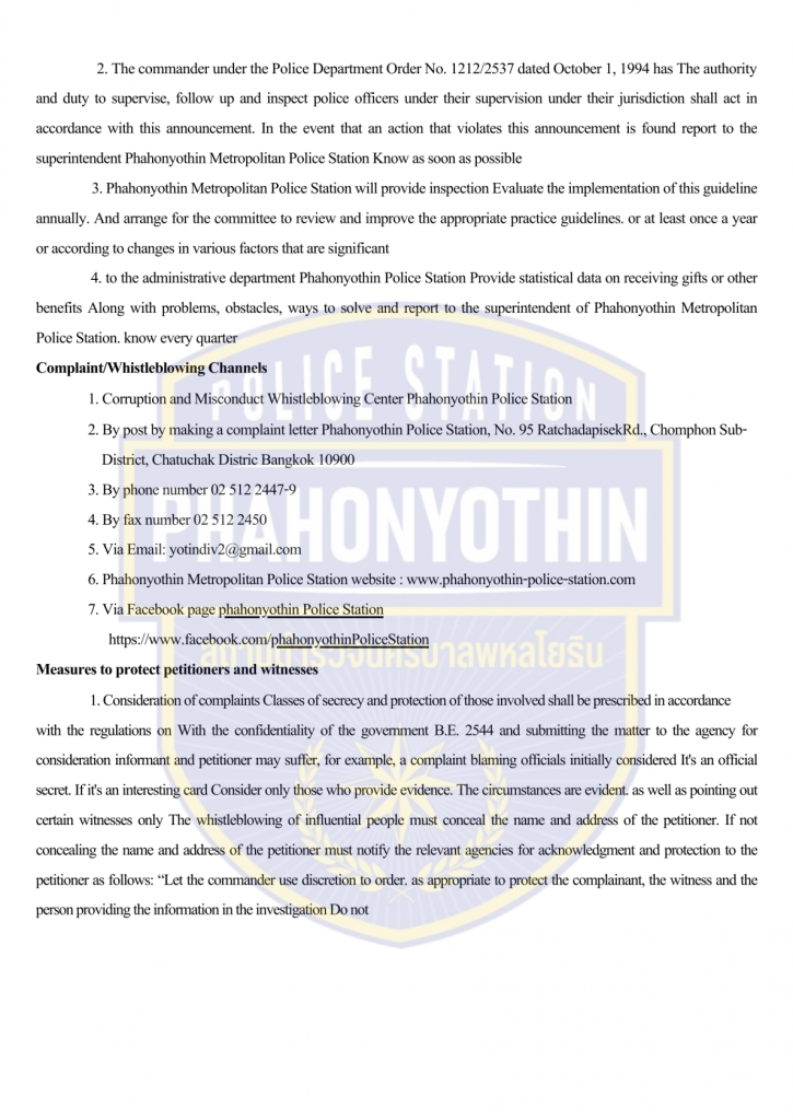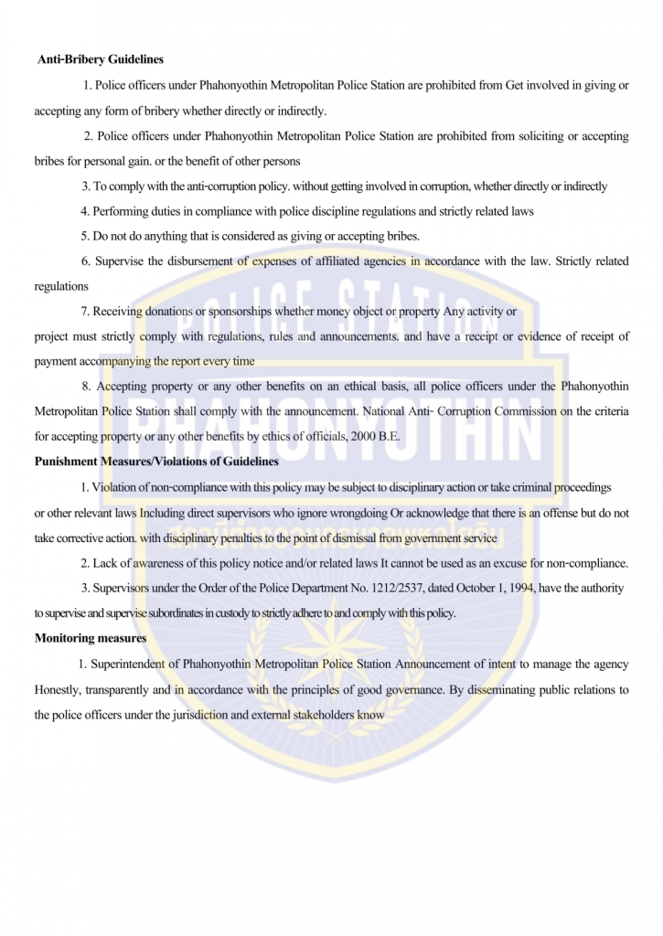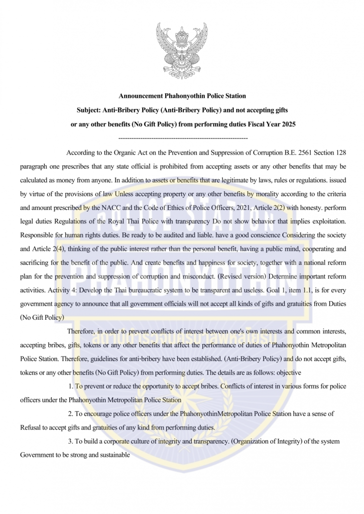 ประชาสัมพันธ์ 6 มกราคม 2568 โดย phahonyothin / ข่าวประชาสัมพันธ์ Announcement Phahonyothin Police Station Subject: Anti-Bribery Policy (Anti-Bribery Policy) and not accepting gifts or any other benefits (No Gift Policy) from performing duties Fiscal Year 2025 FacebookFacebookXXLINELine